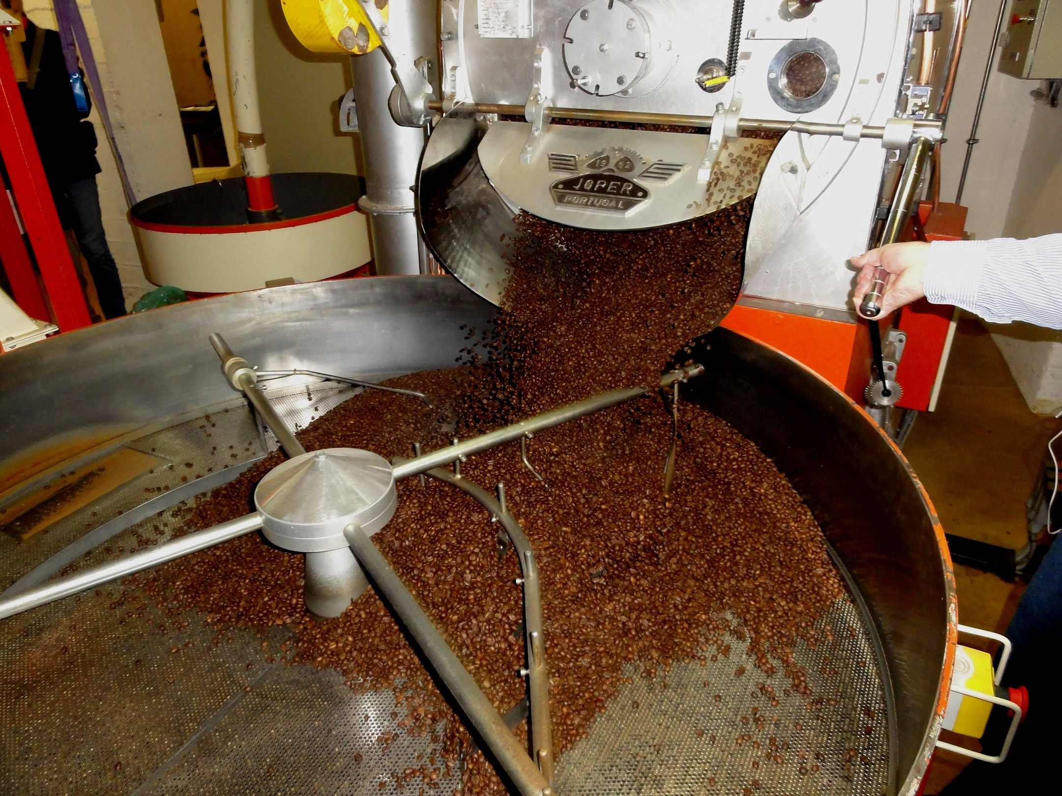 Kaffeebohnen fallen aus der Trommel