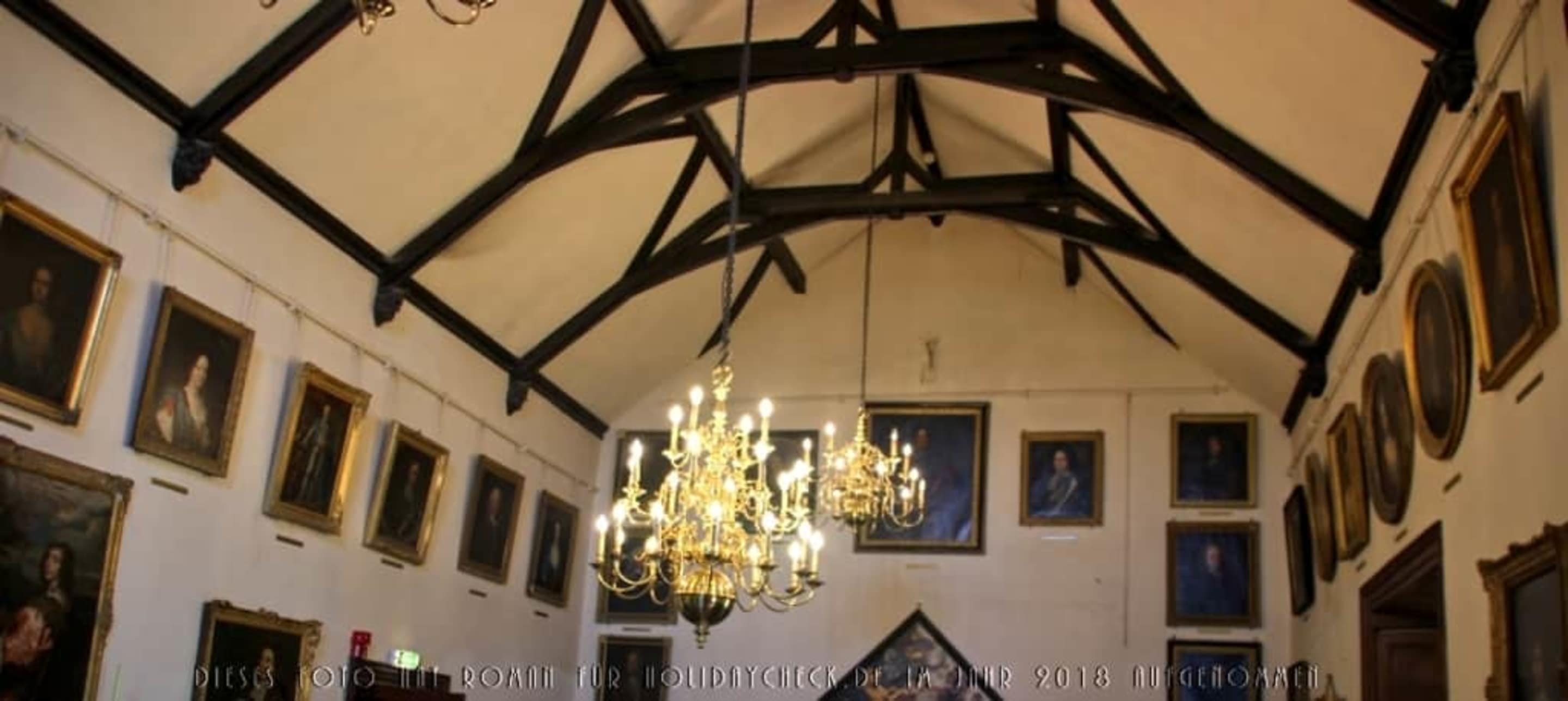 Der obere Teil eines Saals mit vielen Gemälden.