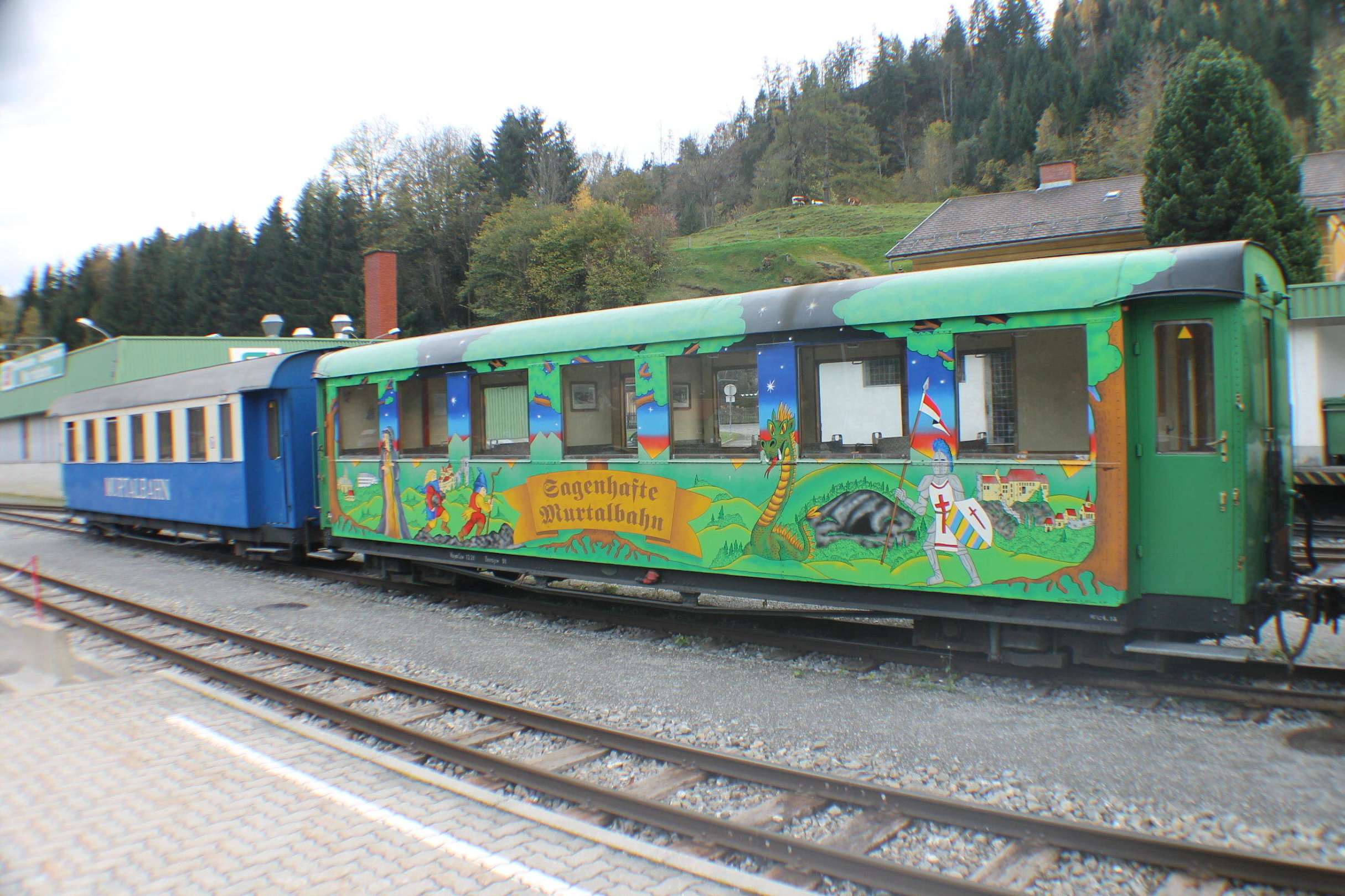 Bunter Nostalgiewagen auf dem Bahnhof Murau