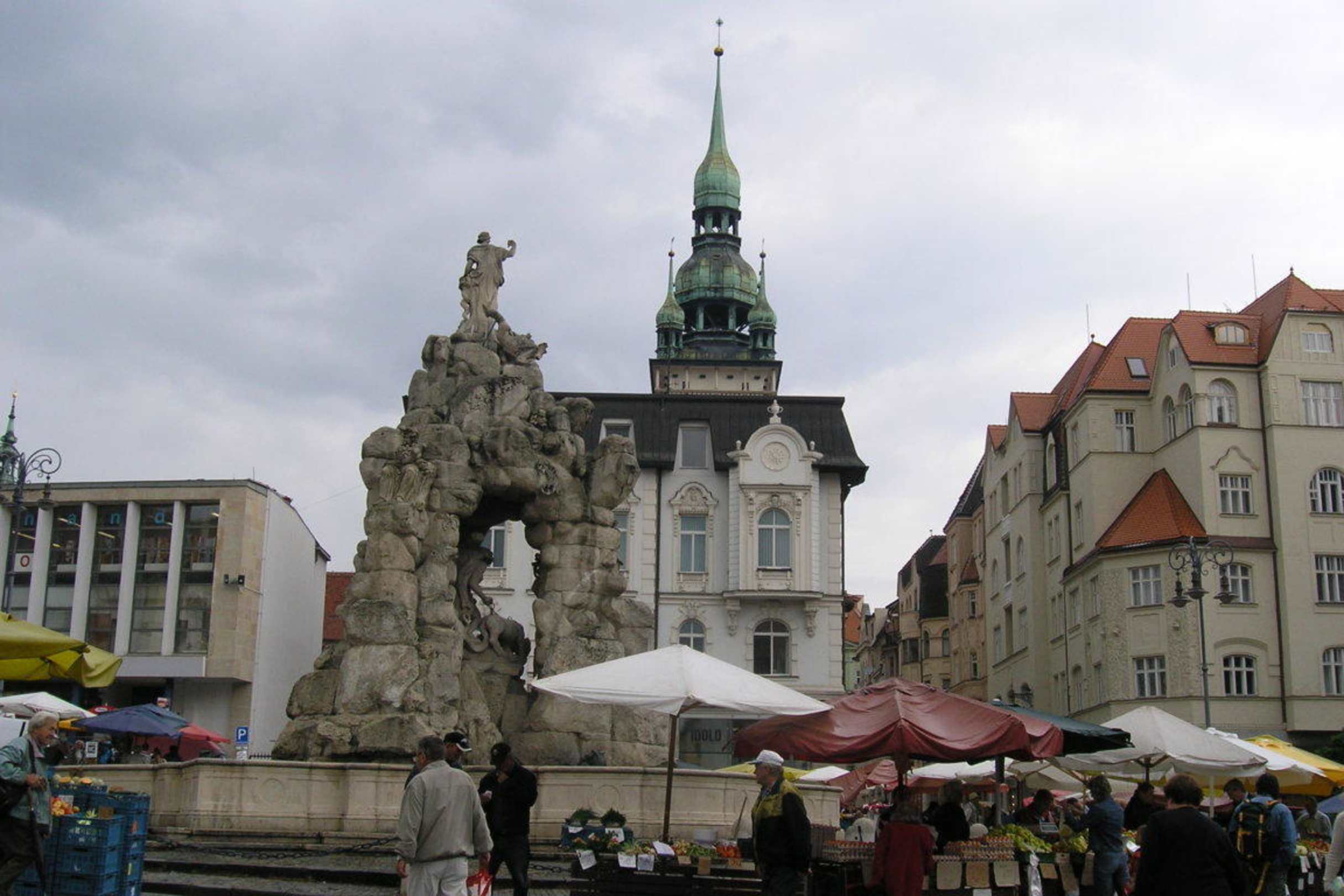 Brunnen mit Rathausturm im Hintergrund