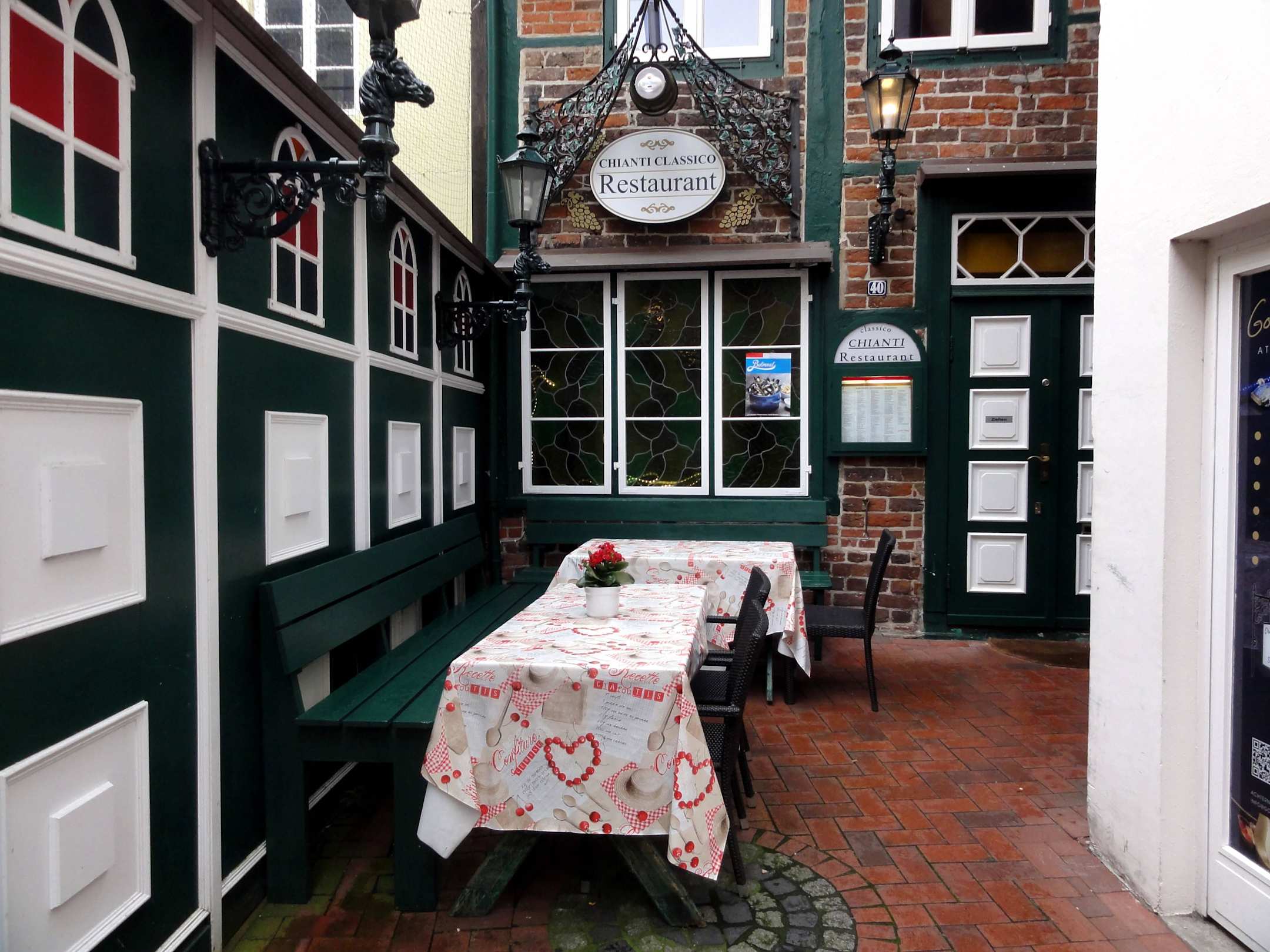 Tische vor dem Eingang