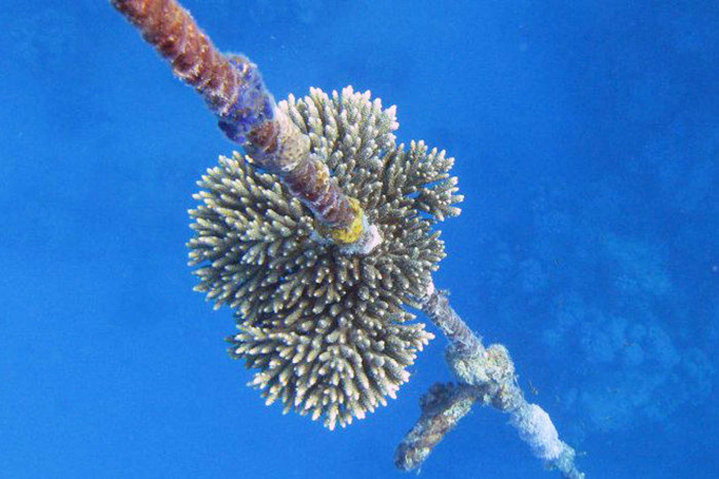 Hirnkoralle am Seil der Boje