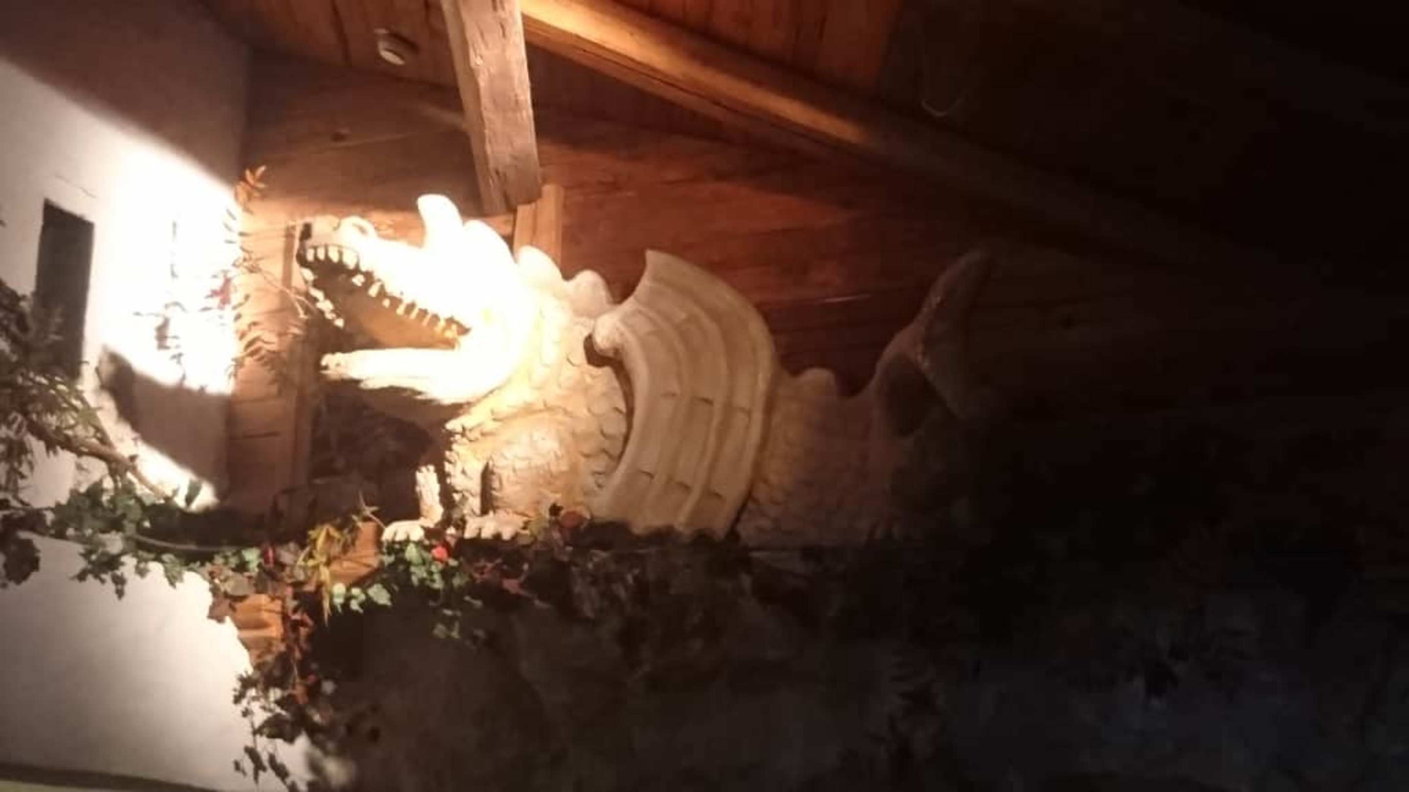 Holzfigur Feuriger Tatzlwurm im Restaurant