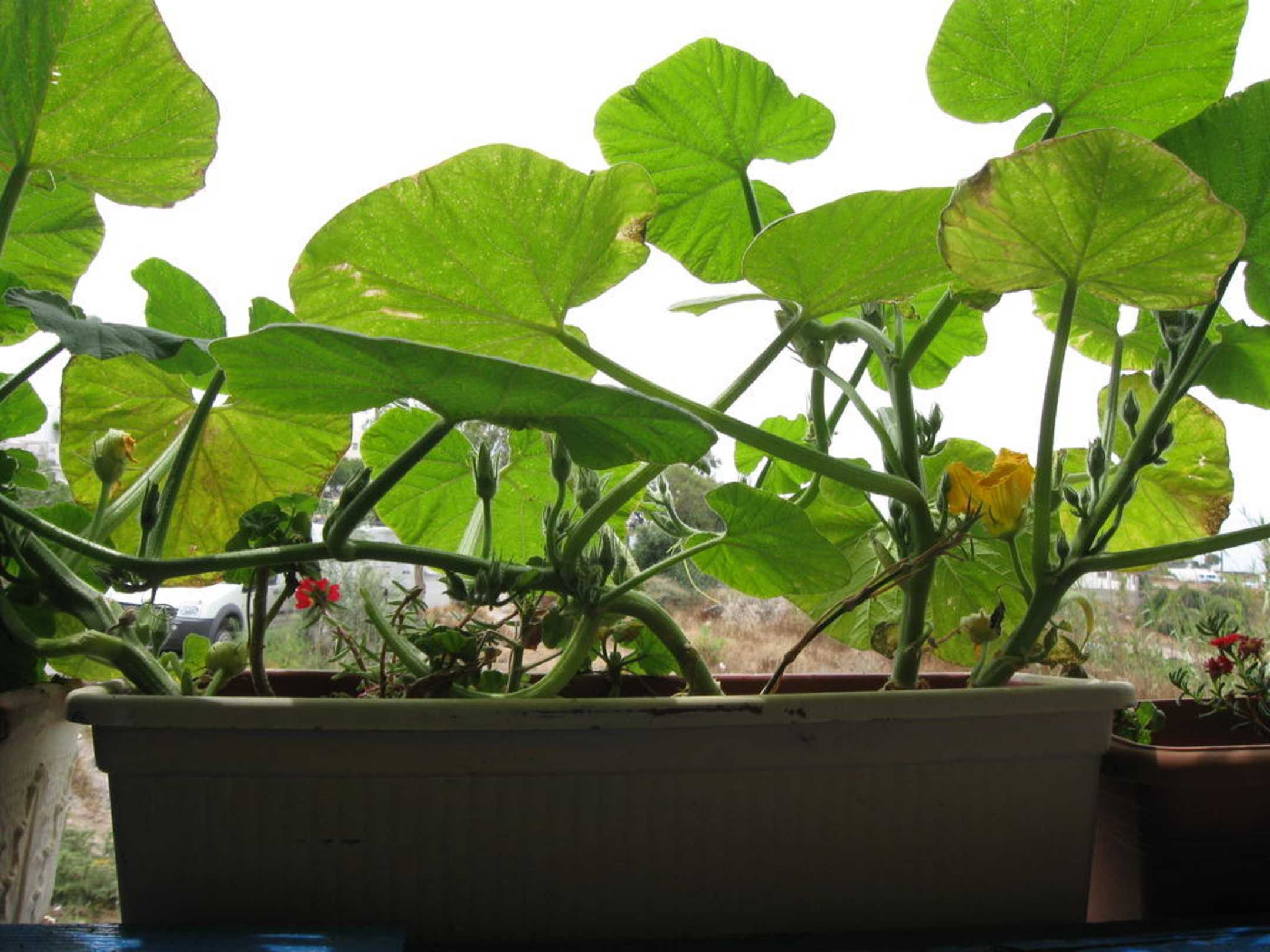 Zucchini im Blumenkisterl am Fenster