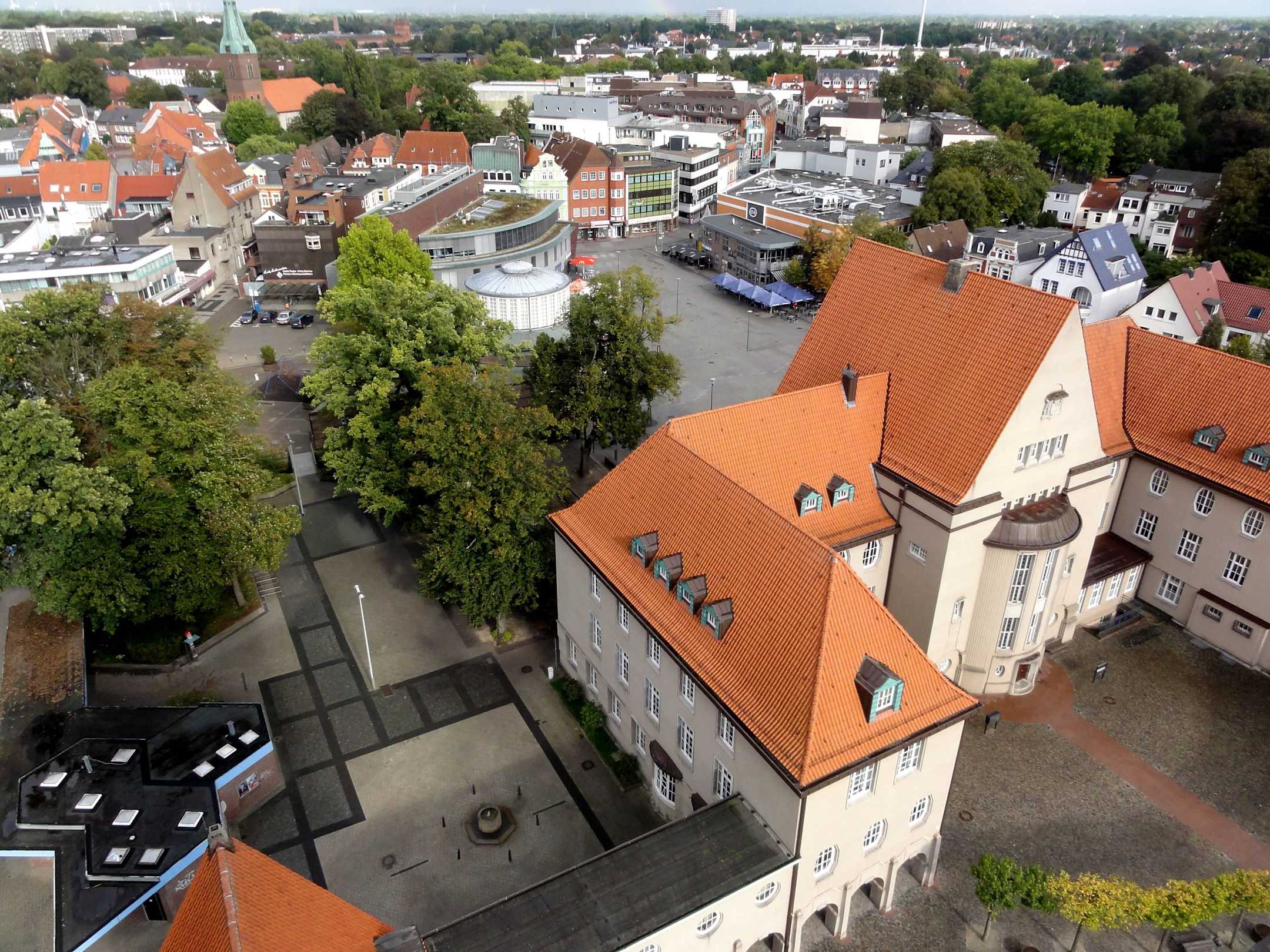 Blick vom Wasserturm auf Rathaus und Innenstadt
