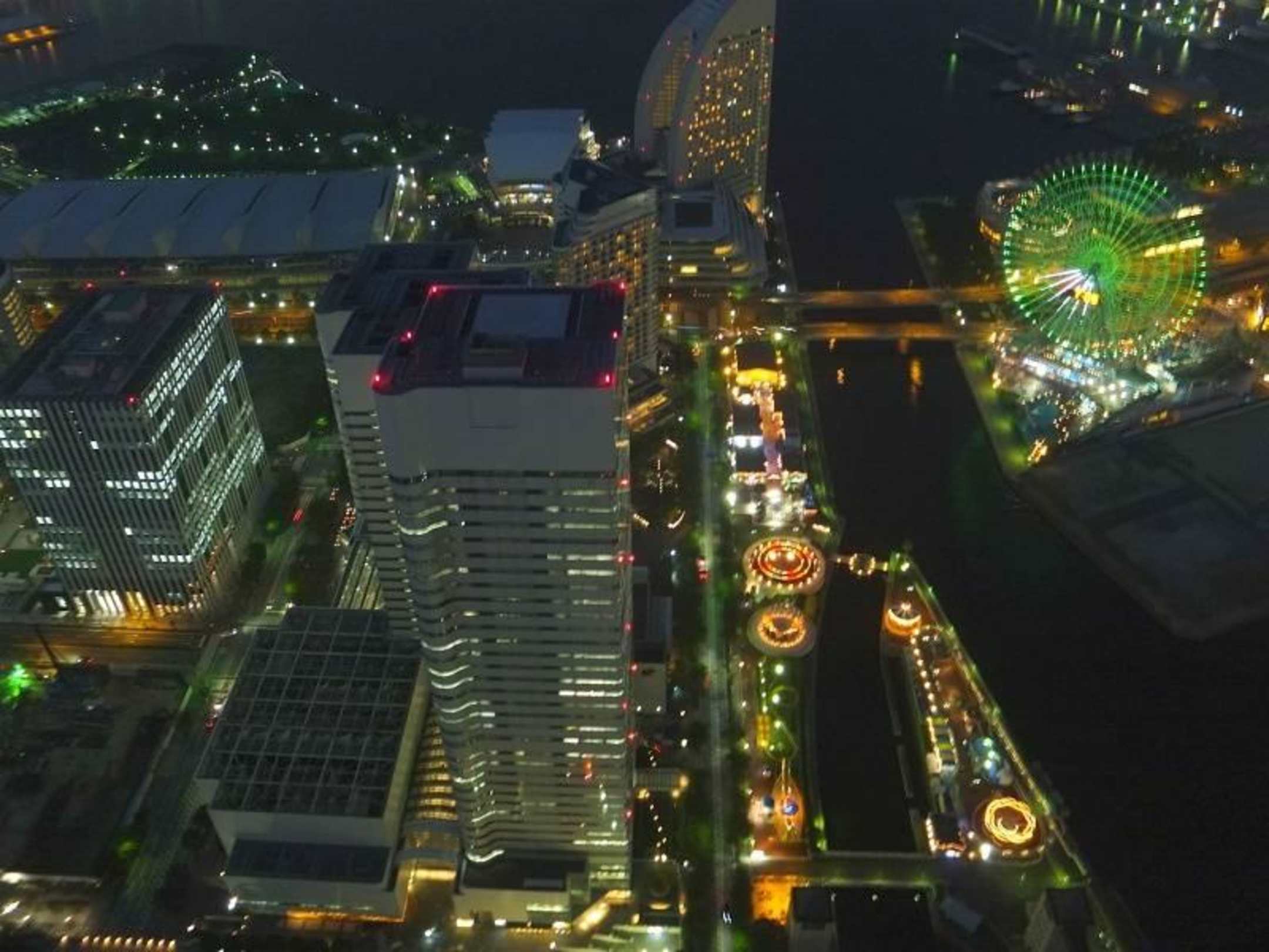 Nocny widok z obserwatorium na wieżowce nad zatoką